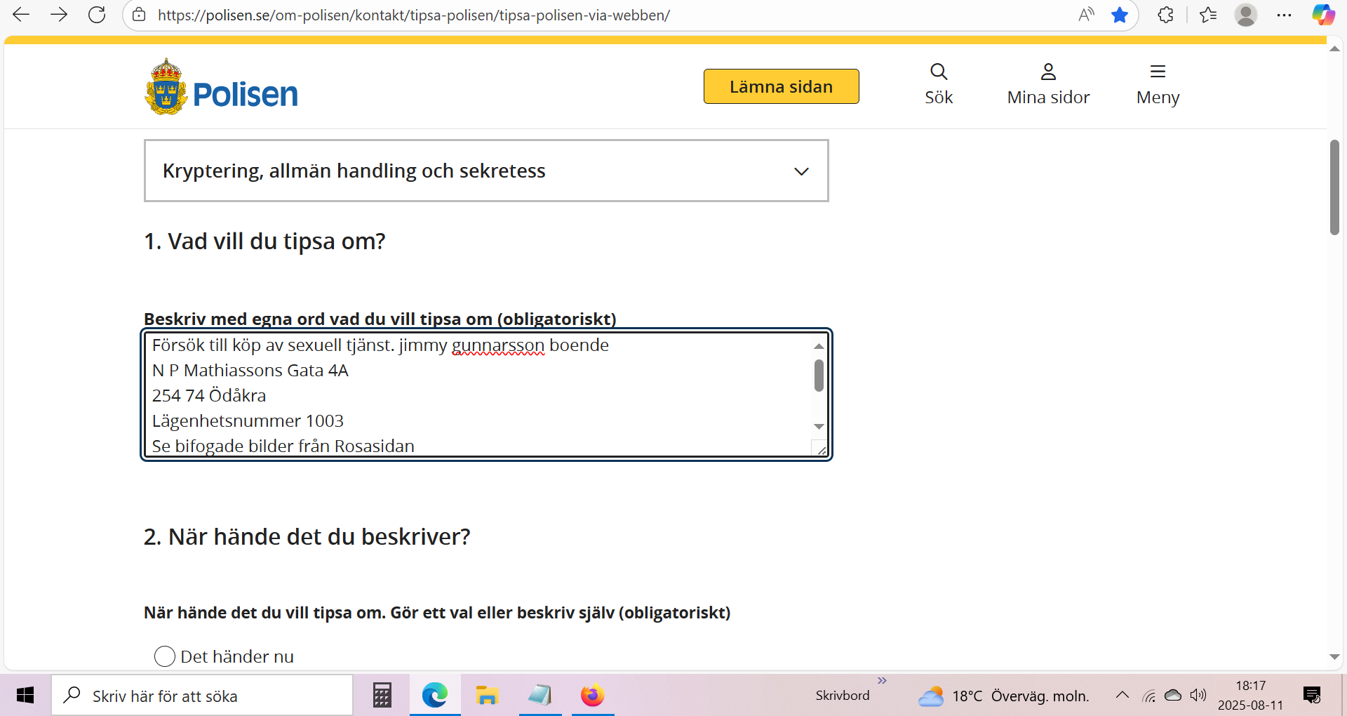Vi vill härmed bekräfta att en polisanmälan har skickats in idag gällande Jimmy Gunnarsson försök till köp av sexuell tjänst. Anmälan är nu registrerad hos polisen för vidare handläggning.